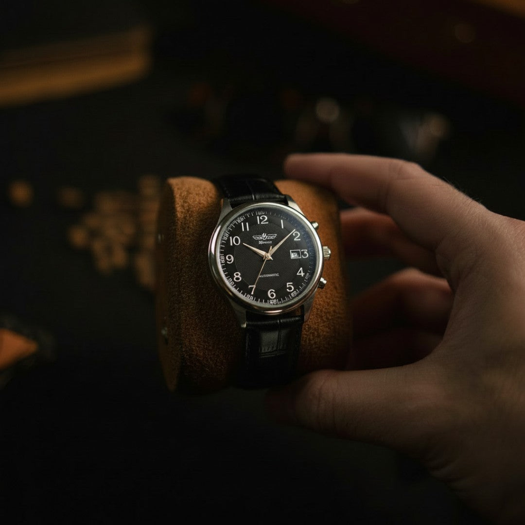 The Darvien® Altair embodies the soul of classic horology — where precision meets timeless artistry. Crafted with an automatic self-wind movement, it operates without batteries, powered by your own motion. Every detail — from its polished stainless-steel case and Arabic numeral markers to its supple leather strap — speaks of refined craftsmanship and enduring elegance.