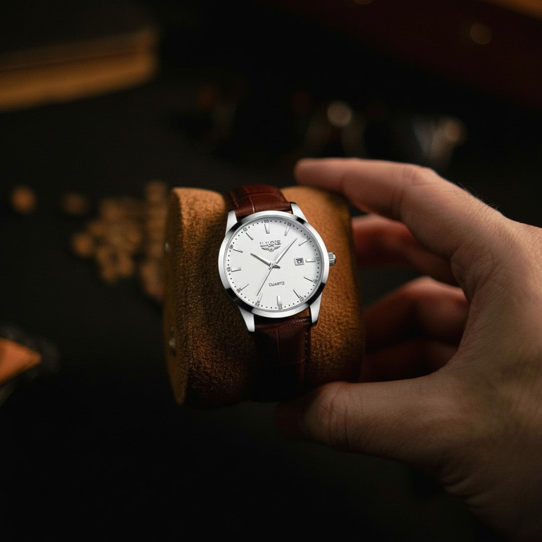 The Darvien® Dominion combines timeless sophistication with modern utility. Featuring a polished stainless-steel case, black dial, and genuine leather strap, it embodies refined craftsmanship designed to stand out in both business and casual settings.