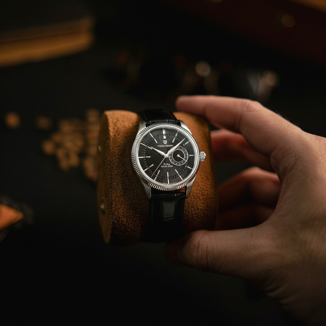 The Darvien® Nautis captures the essence of maritime strength and urban refinement. Inspired by the precision of deep-sea timekeeping, it combines a sleek stainless-steel case, sapphire crystal glass, and minimalist dial for a look that is both powerful and sophisticated. The genuine leather strap adds timeless elegance, making the Nautis equally at home in the boardroom or on open waters.