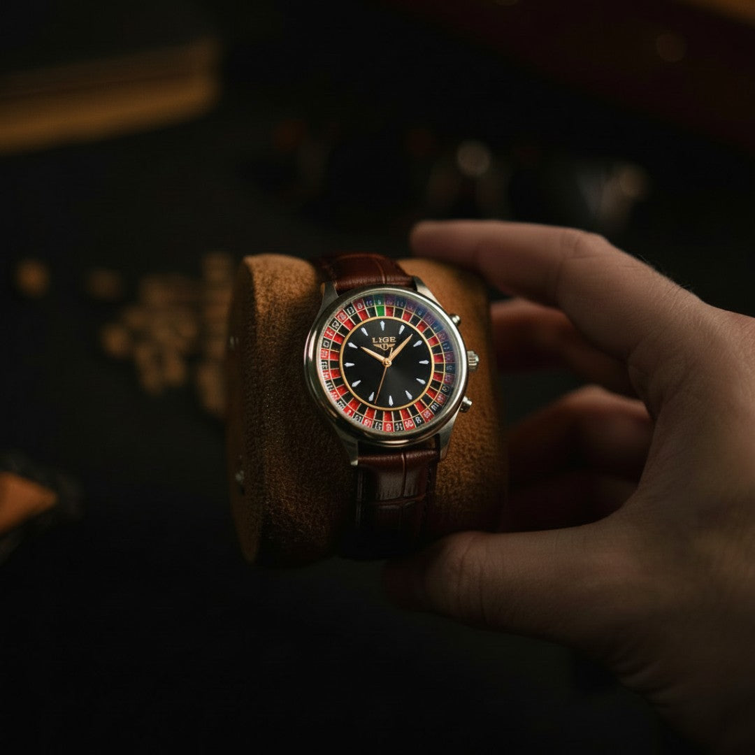 The Darvien® Roulette brings the thrill of the casino floor to your wrist. Featuring a bold 45mm round case, a striking roulette-inspired dial, and a genuine leather strap, this timepiece transforms gaming elegance into timeless watchmaking.
