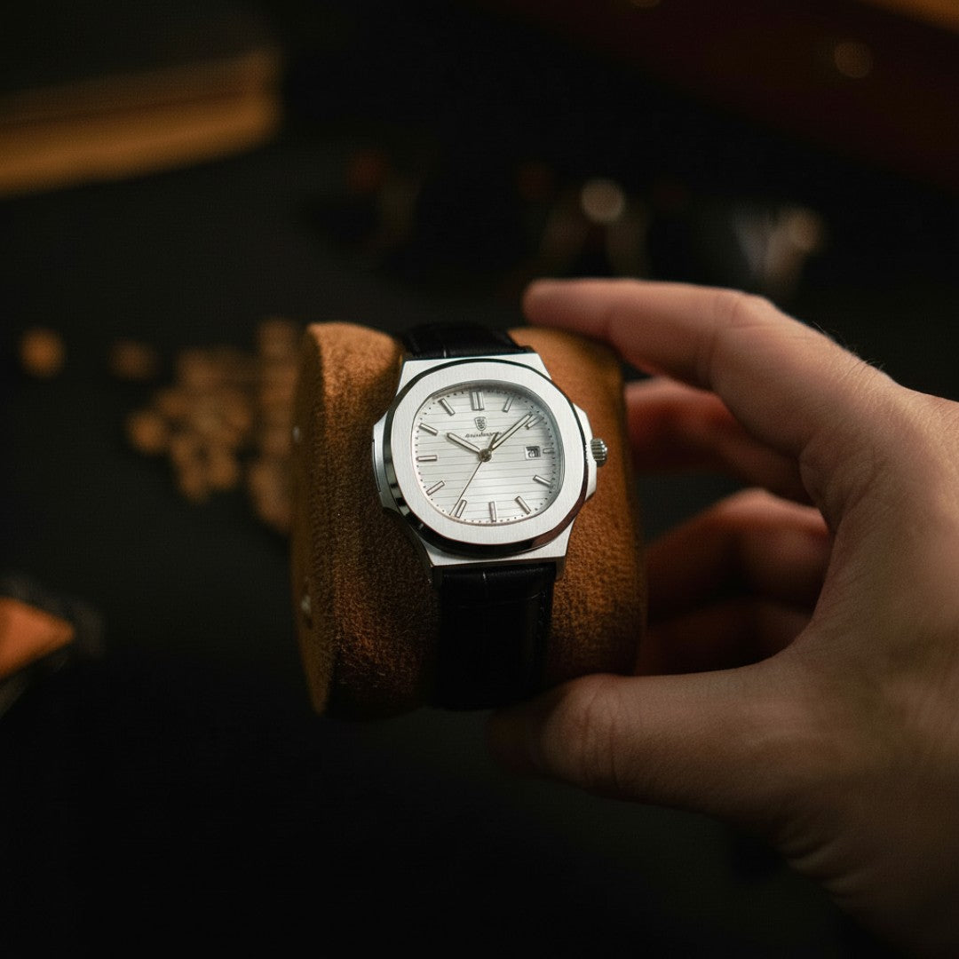 The Darvien® Aetron is a bold statement in contemporary horology — where minimalism meets mastery. Its distinctive square case crafted from polished stainless steel reflects strength and individuality, while the smooth leather strap adds a refined balance of comfort and class. With a numberless dial and luminous detailing, the Aetron redefines elegance with modern precision and timeless appeal.